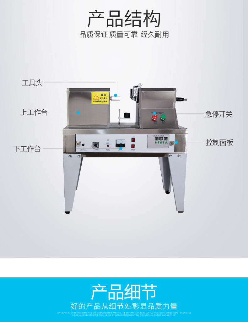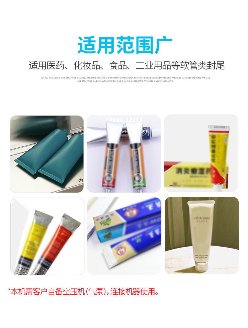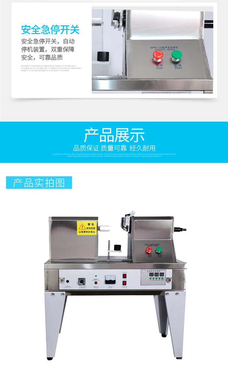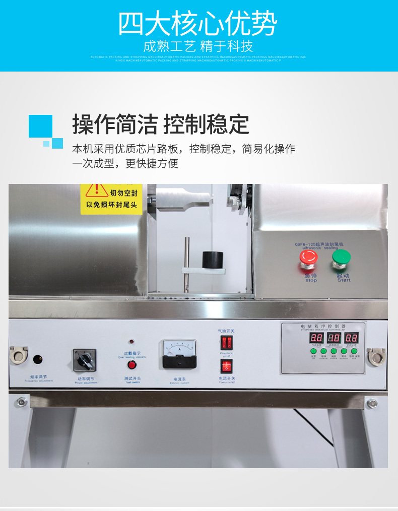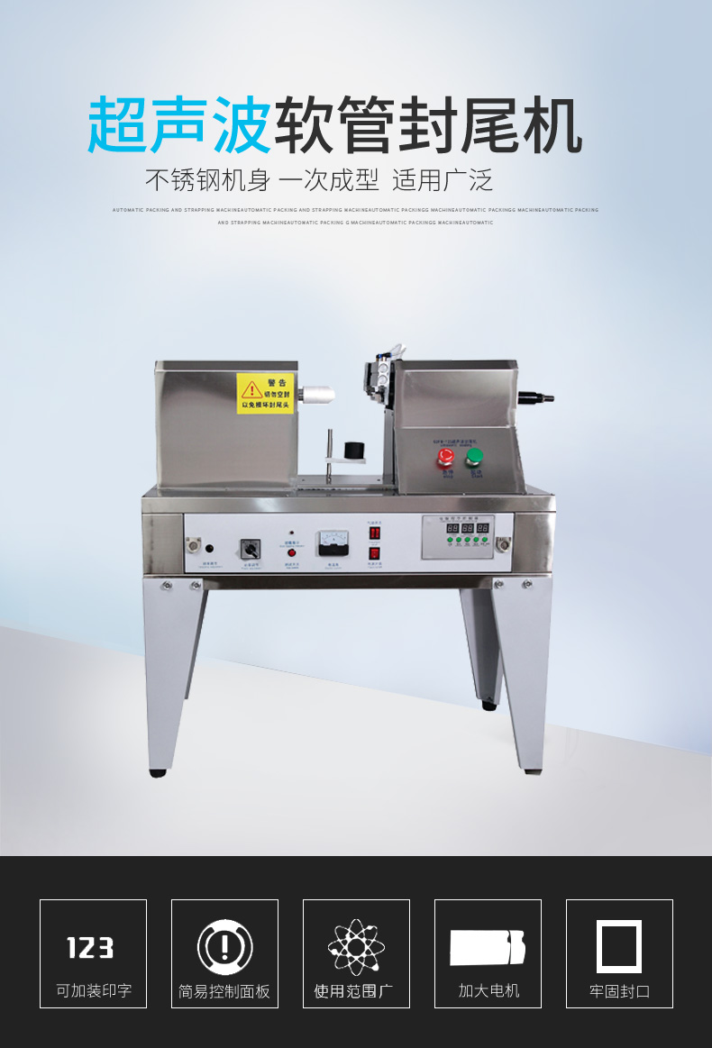 超声波封尾机的工作原理是:机器将高频电能通过换能器转变成为机械能,该能量通过工具头传导到软管工件上,以每秒两万次的超声频率及一定的振幅,使软管工件的接合面产生剧烈摩擦后熔化、瞬间完成胶合过程,这个过程称为超声波软管焊接。超声波封尾焊接机采用电子程序控制,自动化程度高,操作容易,内置电子保护电路。