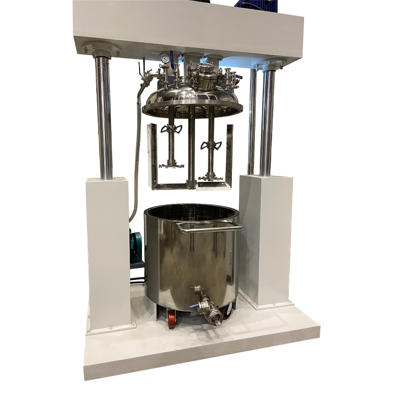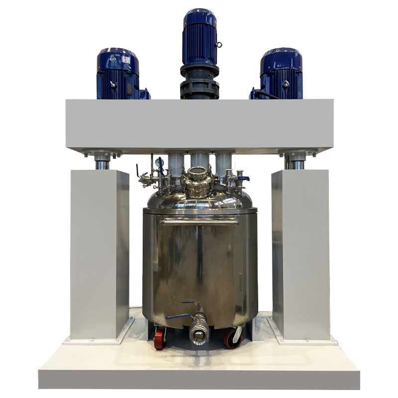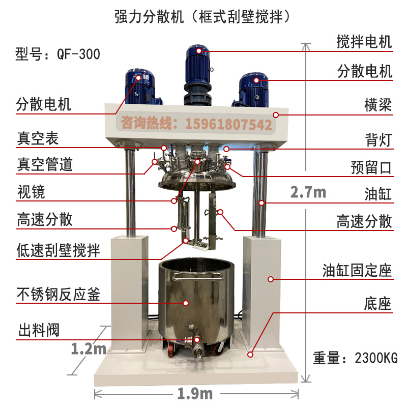 强力分散机有三个电动机,釜内有三根不同形式的搅拌器,其中一个搅拌器在绕釜体轴线转动,其余两个搅拌装置又以不同的转速,绕自身轴线高速自转,使物料在釜内作复杂的运动,受到强烈的剪切和搓合。机器设备内山形刮刀绕釜体轴线转动,将粘在壁上和底部的原料刮出,使其效果更为理想。设备密封性好,可抽真空,具有良好的排气除泡效果。设备缸盖可液压升降,缸体可自由移动,操作十分方便。搅拌器的形式,根据物料要求可为多层桨叶式、框式、蝴蝶式、叶轮式等,以满足各种工艺要求。