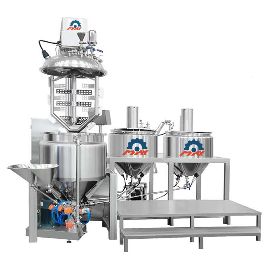 料锅盖为自动升降式,水、油锅中的物料通过输送管道可在真空状态下直接进入乳化锅,出料方式为乳化锅翻转式以及锅底阀放料式等,通过电热管对锅夹层内的导热介质进行加热来实现对物料的加热,加热温度任意设定,自动控制。在夹层内接入冷却液即可对物料进行冷却,操作简单、方便、夹层外设有保温层。均质系统和搅拌系统可分开使用,也可同时使用。物料的微粒化、乳化、混合、调匀、分散等可于短时间内完成。与物料接触部分采用优质不锈钢(常用304,医用316L)内表面镜面抛光,真空搅拌装置卫生清洁,采用符合GMP规范的卫生标准制造,是客户理想的膏霜生产设备。